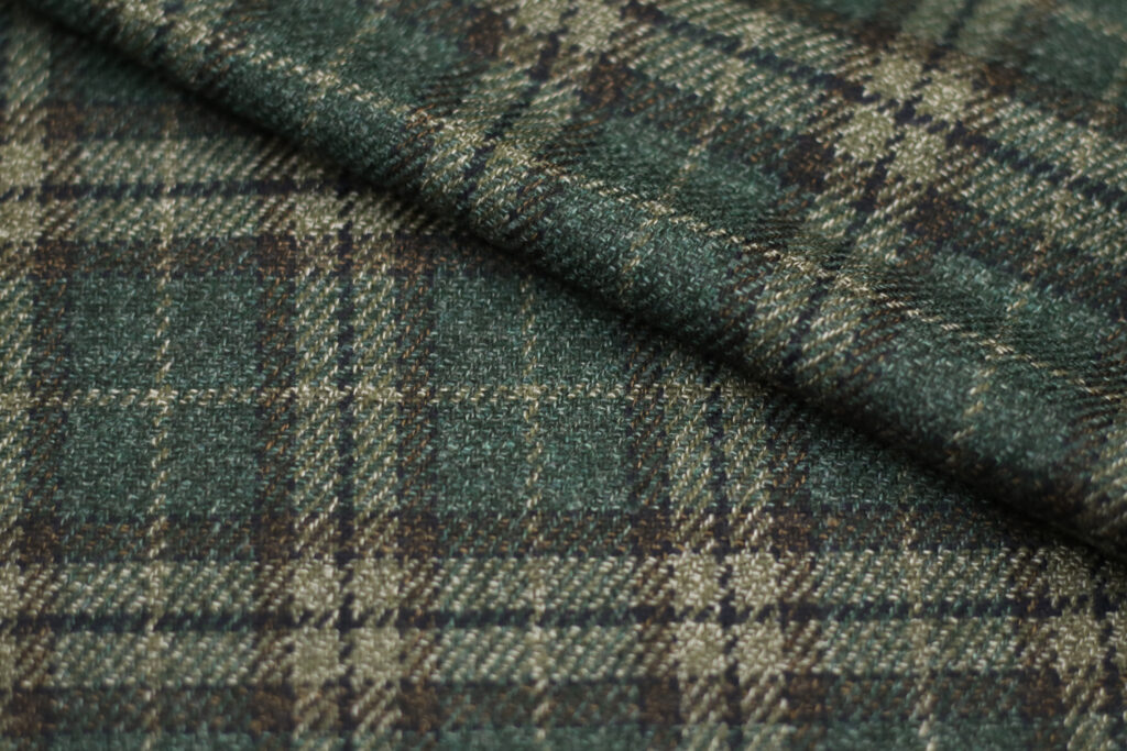 紺ブレにグリーンのチェック柄を合わせたコーディネート